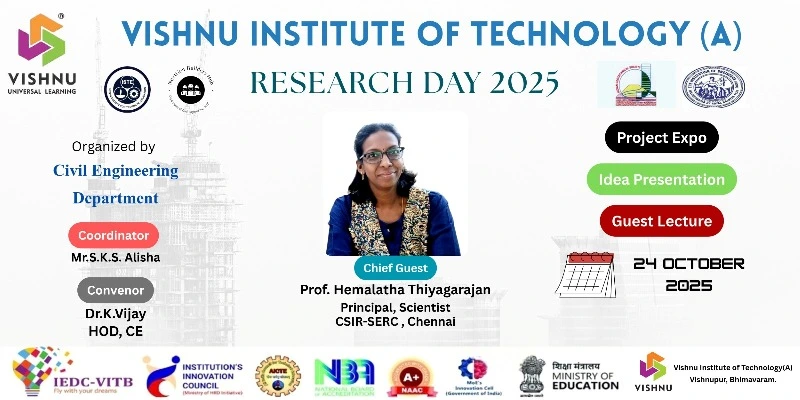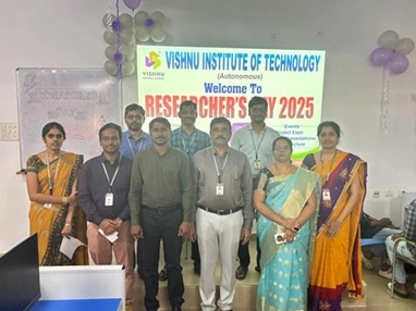 ![]() | The Department of Electrical & Electronics Engineering, Vishnu Institute of Technology, Bhimavaram, successfully organized Researcher’s Day EEE on 7 January 2025. The event was inaugurated by the Principal, Vice Principal, Dean R&D, HoD-EEE, coordinators, and the Chief Guest Dr. T Ramesh from NIT Andhra Pradesh. Highlights included 13 idea presentations, a project expo with 14 projects, and a guest lecture on patent filing by Dr. R Khasim. With active participation from 80 students, prizes were awarded to the best ideas and projects during the valedictory, showcasing strong research and innovation culture. | ||||||||||||
