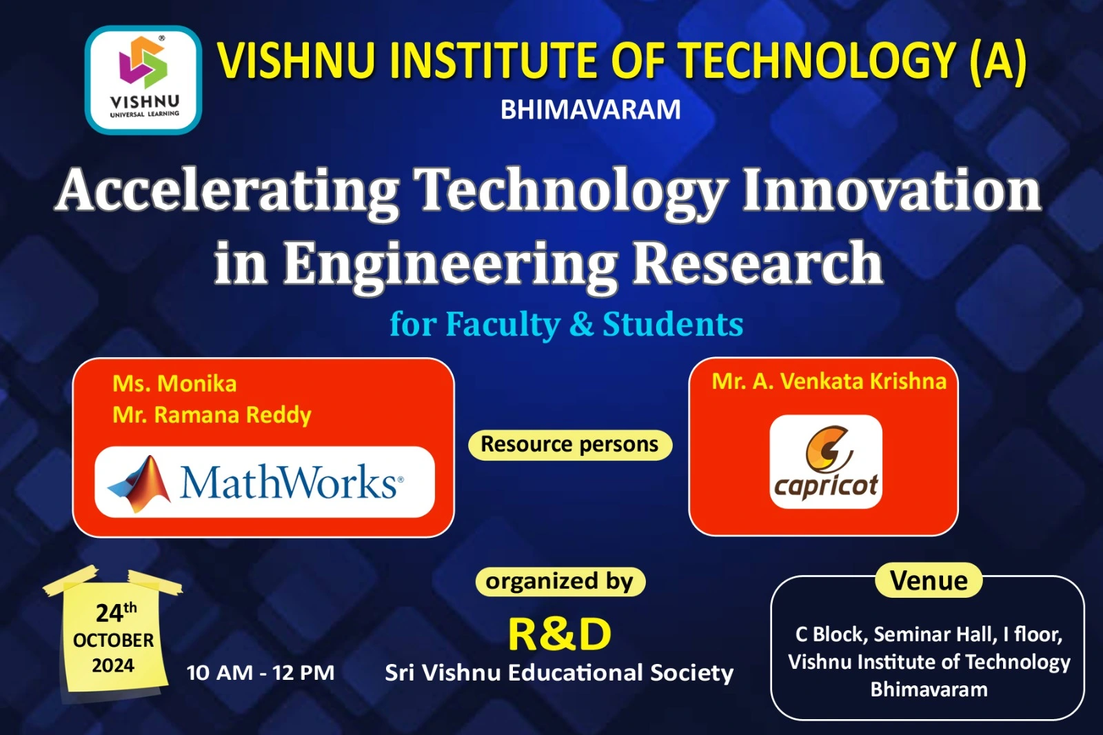 ![]() | A workshop on "Accelerating Technology Innovation in Engineering Research" was conducted on October 24, 2024. The event was organized exclusively for the faculty and students of VIT. Mr. A. Venkata Krishna of Capricot Technologies Pvt. Ltd., Bangalore and Mr. Ramana Reddy of Math Works, Bangalore, served as industry resource experts for the workshop.The key takeaways from the workshop centered on enhancing researchers perspectives, utilizing field-validated tools for innovation, bridging the gap between research and implementation, and fostering collaboration. The workshop emphasized a shift toward practical, impact-oriented research that prioritizes collaboration, the use of validated methodologies, and the effective translation of research into actionable solutions. This approach not only enhances the relevance of research but also lays a foundation for sustainable, real-world applications that tackle critical industry challenges. | ||||||||||||