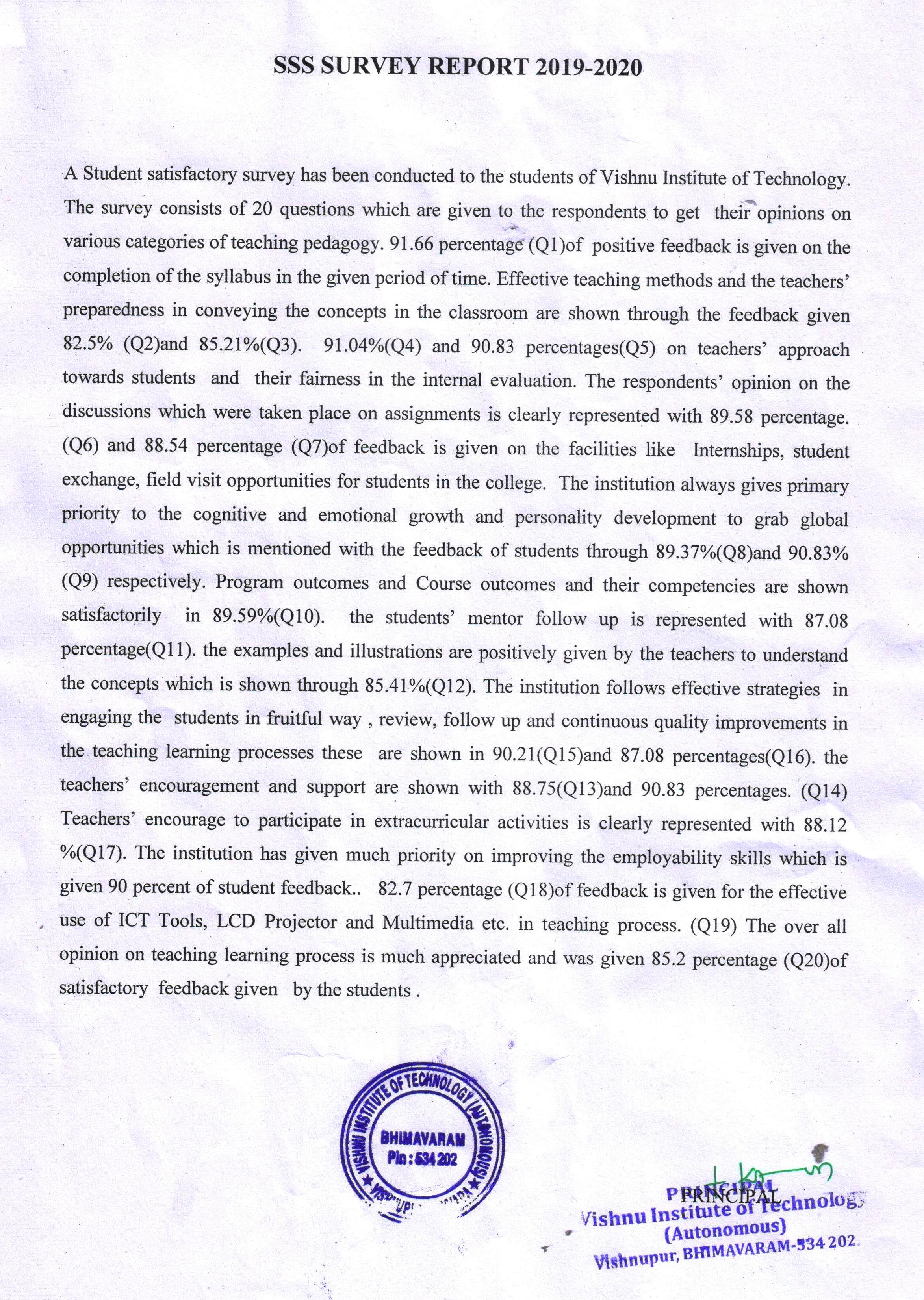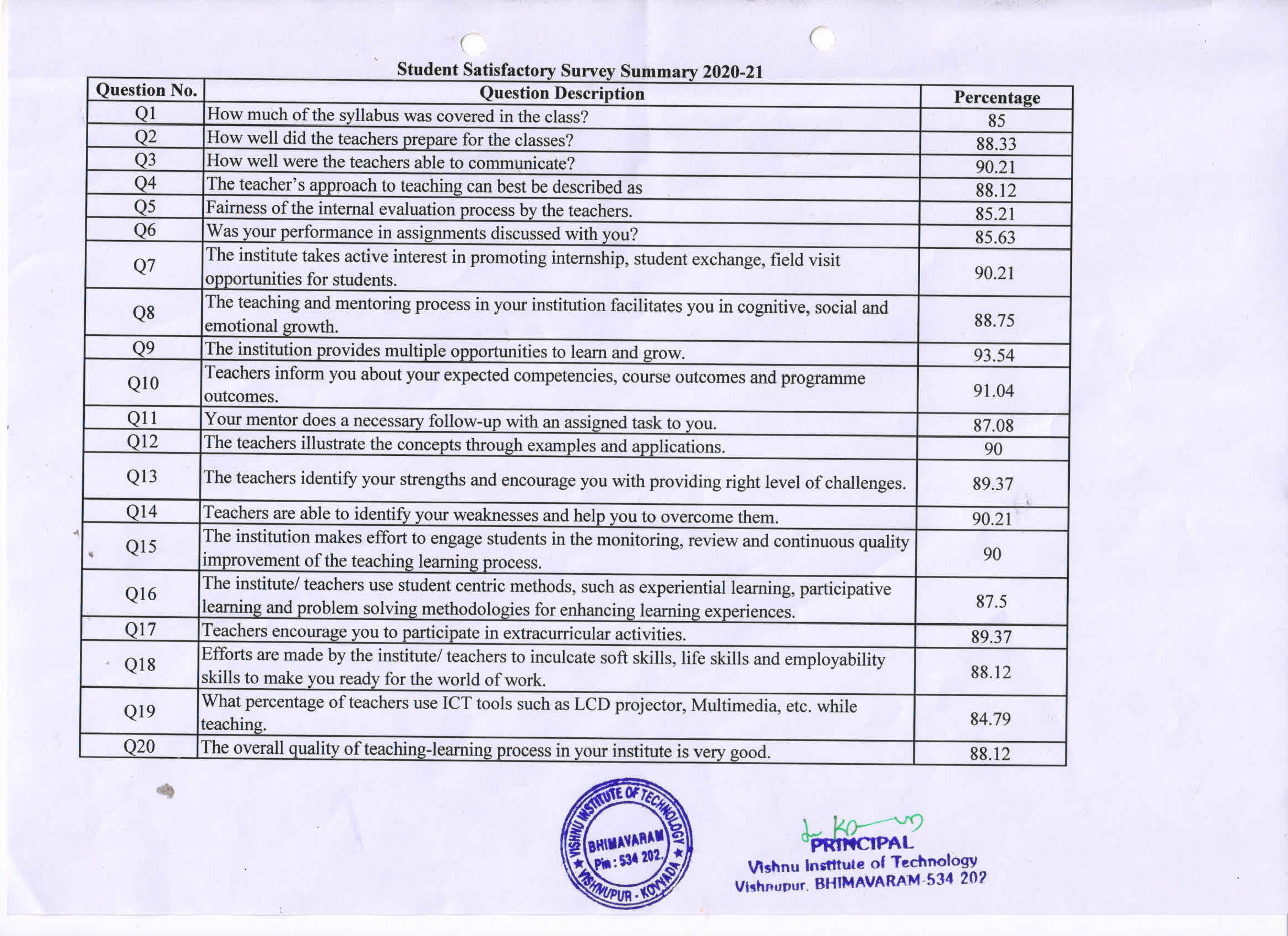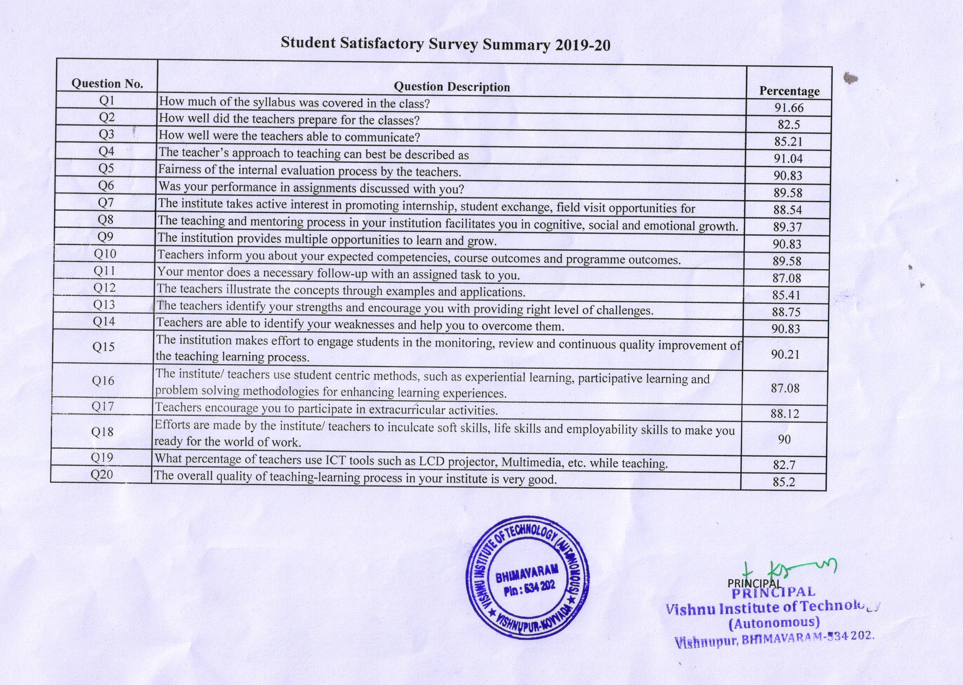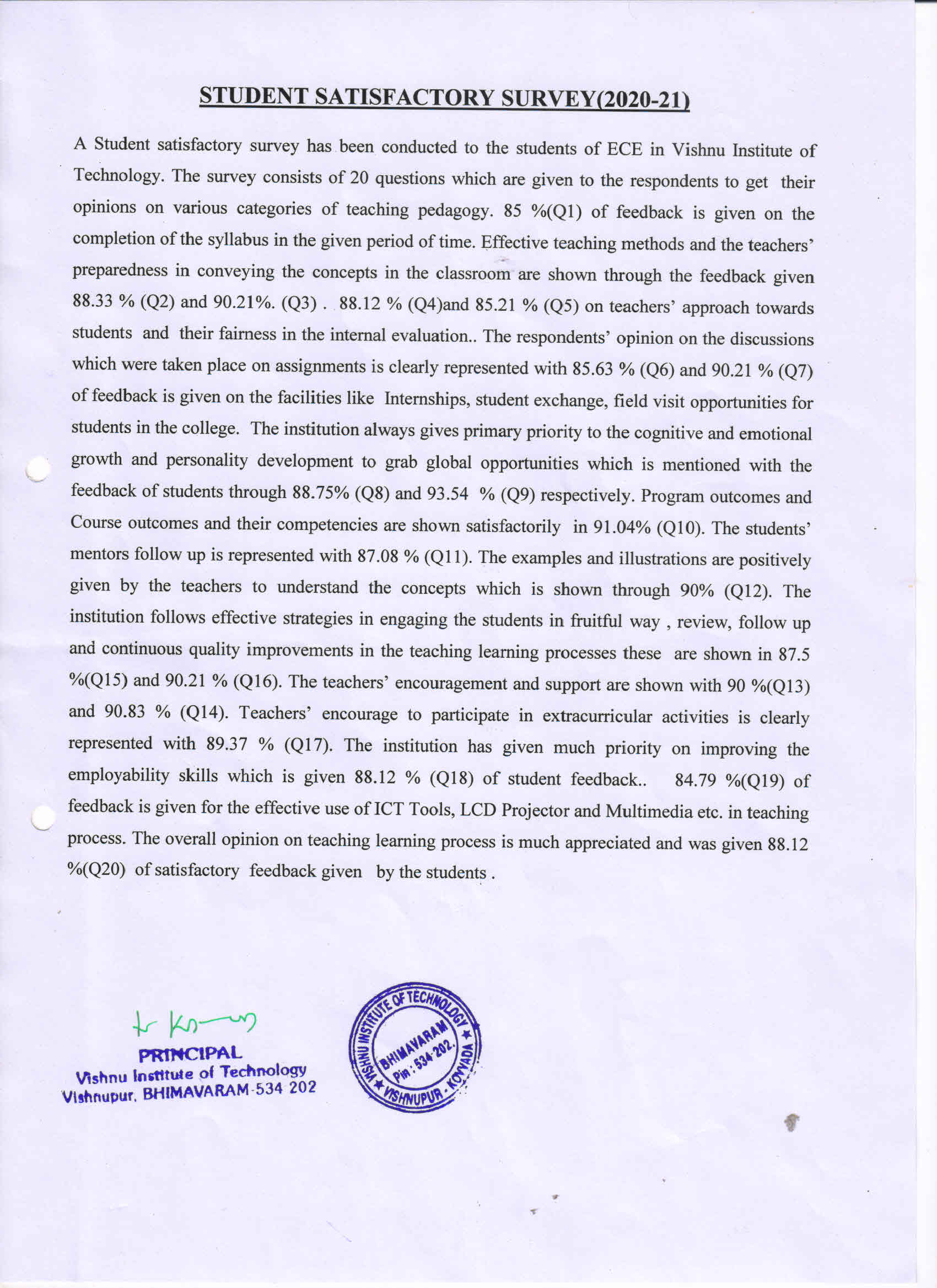 A Student satisfactory survey has been conducted to the students of ECE in Vishnu Institute of Technology. The survey consists of 21 questions which are given to the respondents to get their opinions on various categories of teaching pedagogy. 91.66 percentage of feedback is given on the completion of the syllabus in the given period of time. Effective teaching methods and the teachers' preparedness in conveying the concepts in the classroom are shown through the feedback given 82.5% and 85.21%. 91.04 and 90.83 percentages of feedback are given on teachers' approach towards students and their fairness in the internal evaluation. The respondents' opinion on the discussions which were taken place on assignments is clearly represented with 89.58 percentage. 88.54 percentage of feedback is given on the facilities like Internships, student exchange, field visit opportunities for students in the college. The institution always gives primary priority to the cognitive and emotional growth and personality development to grab global opportunities which is mentioned with the feedback of students through 89.37and 90.83 percentages respectively. Program outcomes and Course outcomes and their competencies are shown satisfactorily in 89.59%. the students' mentor follow up is represented with 87.08 percentage. the examples and illustrations are positively given by the teachers to understand the concepts which is shown through 85.41%. The institution follows effective strategies in engaging the students in fruitful way , review, follow up and continuous quality improvements in the teaching learning processes these are shown in 90.21and 87.08 percentages. the teachers' encouragement and support are shown with 88.75and 90.83 percentages. Teachers' encourage to participate in extracurricular activities is clearly represented with 88.12 %. The institution has given much priority on improving the employability skills which is given 90 percent of student feedback.. 82.7 percentage of feedback is given for the effective use of ICT Tools, LCD Projector and Multimedia etc. in teaching process. The over all opinion on teaching learning process is much appreciated and was given 85.2 percentage of satisfactory feedback given by the students.