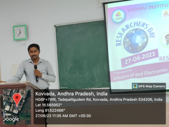 ![]() | On 17th June 2023, ECE department, Vishnu Institute of Technology (A) conducted "Researchers Day" as an annual showcase of the Research and Development contributed by students. The undergraduate and postgraduate students and faculty presented their research outcomes to their peers, faculty and external experts. A total of 13 student teams participated in oral presentation and 14 teams participated in poster presentation. Dr Kiran Kumar addressed the gathering with his speech, he appreciated the efforts made by the faculty and students. The event continued with presentations from faculty, students and the prize distributions to the winning student teams. | ||||||||||||