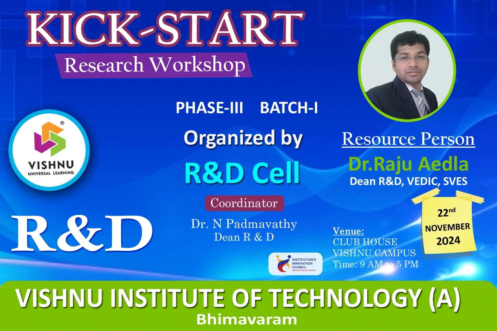 ![]() | The "Research Kick-Start Workshop" was held on 22nd November 2024, at the Club House, Vishnu Campus. It was organized by the R&D Cell for participants from Phase-III, Batch-I.The aim of the workshop is to build the research appetite, culture and mindset amongst the teaching fraternity. Through this workshop, the faculty were enabled with technical writing skills and had to give a presentation on their research findings. | ||||||||||||