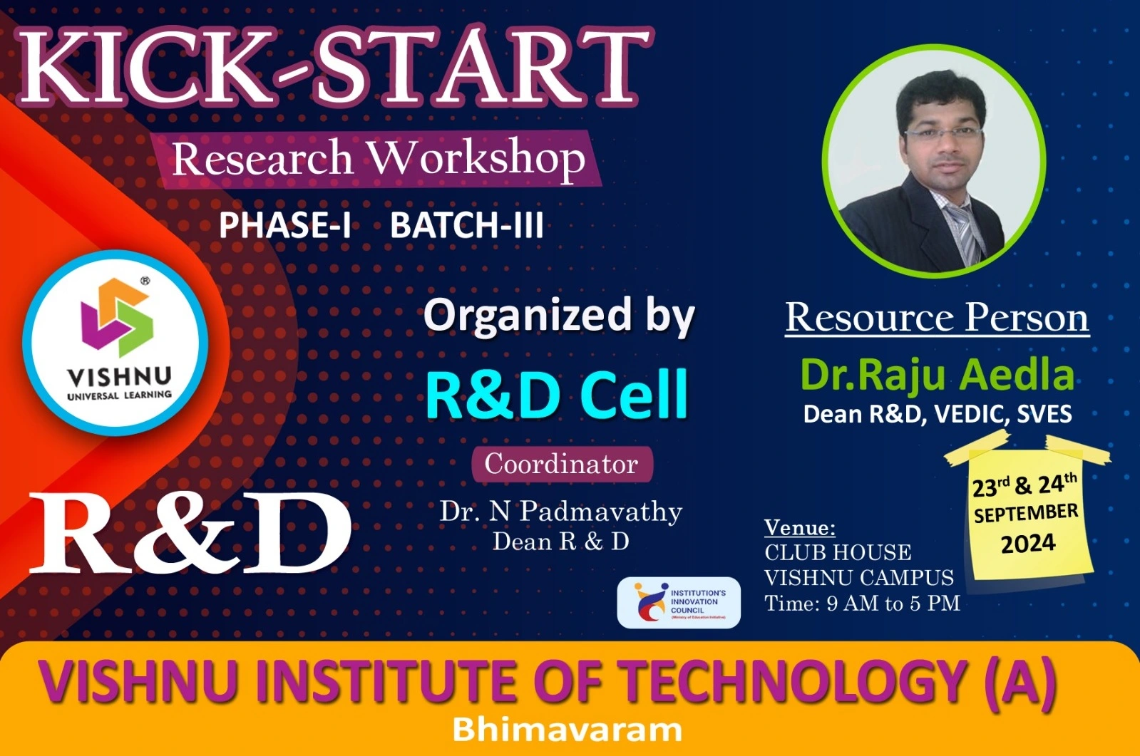 ![]() | The "Research Kick-Start Workshop" was held on 23rd and 24th September 2024, from 9:00 AM to 5:00 PM each day at the Club House, Vishnu Campus. It was organized by the R&D Cell for participants from Phase-I, Batch-III.The workshops primary focus was on training participants in research paper writing, equipping them with essential skills for structuring, drafting, and formatting academic papers. The sessions offered valuable guidance on organizing research ideas, meeting publication standards, and effectively presenting findings to the research community. This hands-on training provided a solid foundation for participants to excel in academic writing and successfully disseminate their research. | ||||||||||||