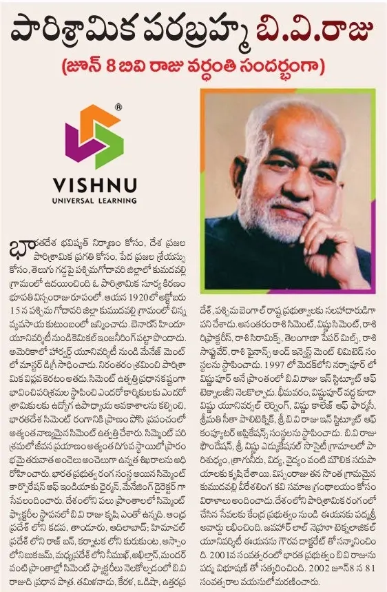 Throughout his life, both as an industrialist and an educationist, Late Padma Bhushan Dr. B.V. Raju continued to devote himself to the service of the people. He always kept his doors open to the poor and needy and participated actively in welfare programmes for improving the socio-economic conditions of society. His services for the welfare of the people are innumerable and invaluable.